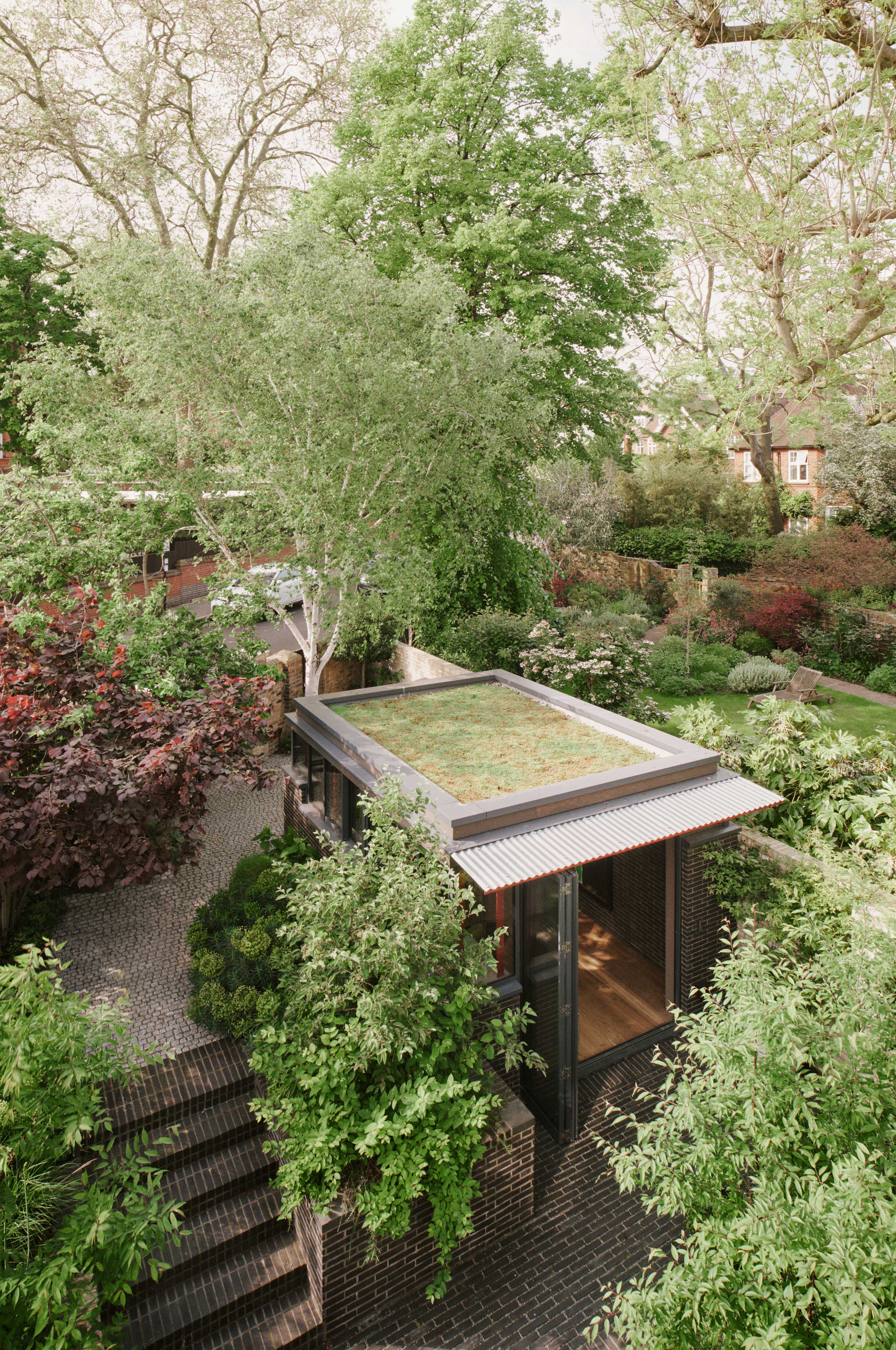 The architectural expression inspires a unifying and embellished ground plane of small stone granite units that are grit jointed for porosity. The is no front and back garden, our site planning integrates intimate enclaves around house and garden room embedded in the landscape with a green roof over. Interconnected levels negotiate the natural topography, defining places to relax, a place to propagate, nurture, read and dream. A spongey approach for resilience in the paving construction to absorb and attenuate, while articulating beds of open soil to celebrate a Mediterranean planting palette – protected sun traps and a blissful escape on the doorstep.